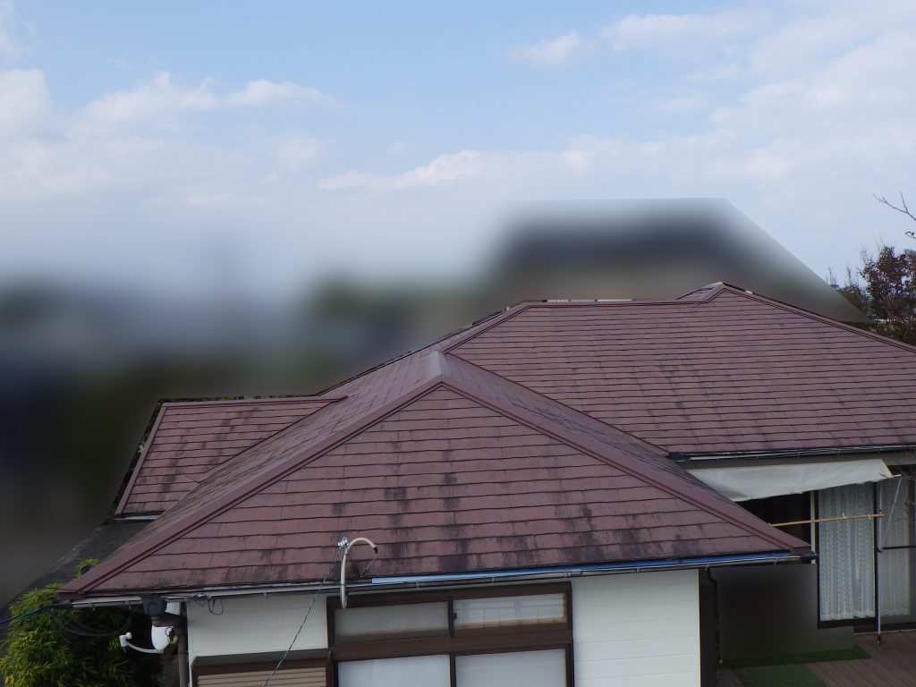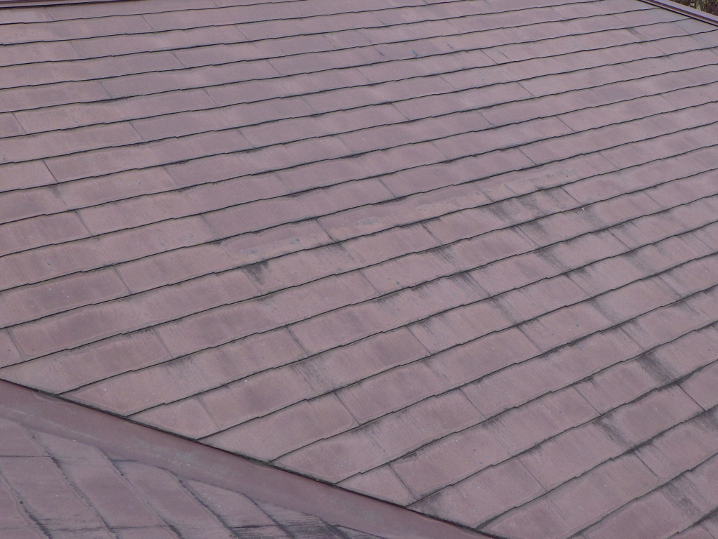 施工前の屋根は、全体的に色あせが進み、黒ずみやコケ・汚れが目立つ状態でした。